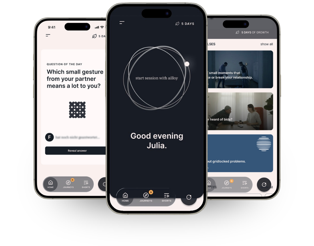 Text or voice-to-text. Solo or together. Structured conversations grounded in evidence-based relationship therapy methods. ailloy asks the right questions — and sometimes not the comfortable ones.